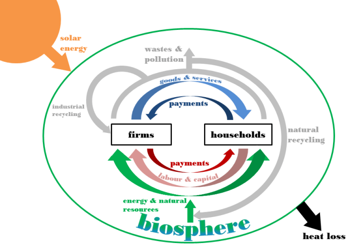 To better understand this argument, it is worth looking at the issue from first principles – beginning with the circular flow model of mainstream economic theory (Figure 1). Here all economic activity is considered to be contained within a whole, self-contained system, where the environment is a subsystem of the greater economy. Resources produced by the environment (i.e natural capital) are converted to human capital during the economic process, but environmental degradation associated with this conversion is not necessarily a problem since human made capital could effectively substitute for the loss of natural capital. Increased efficiency in the conversion of natural to human capital, coupled with technological advancements, mean that according to this viewpoint the economy can increase in scale without any limits, and as such human wellbeing can continue to increase indefinitely.