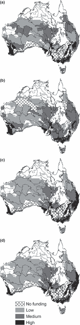 Figure 2. Investment into conservation actions at a continental scale for all 72 bioregions, according to our four ROI frameworks: (a) Two-action-independent ROI, (b) three-action-independent ROI, (c) action-dependent ROI and (d) action-dependent ROI with spatial targeting. The map shows the priority bioregions for investment as indicated by the total percentage of funding for a bioregion summed over all actions, which is shown as low (up to 1%), medium (up to 2%) or high (up to 6%).