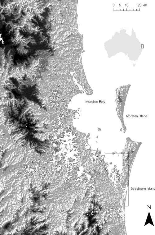 Figure 1. Outline of study area, South-east Queensland (SEQ) Australia, indicated with black box inset. Broad figure shows SEQ for context, indicating elevation, main urban areas (white) and major river systems (grey). Study restricted to the insert area due to memory limitations imposed by the size of the LiDAR elevation data.