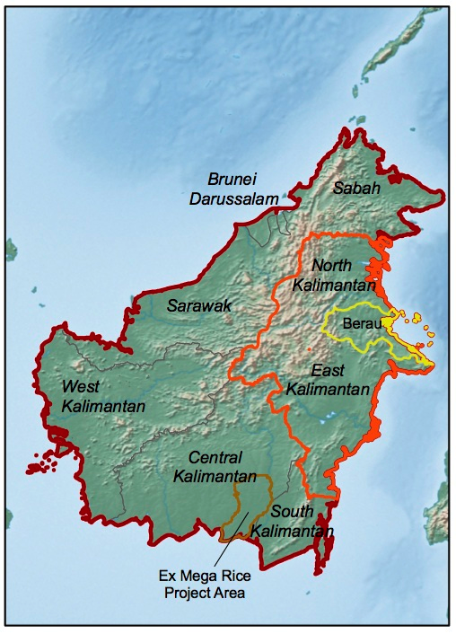 Our projects include research in East & North Kalimantan (projects 1,2,5, in orange), Berau regency within East Kalimantan (projects 2,4, in yellow), and the Ex Mega Rice Project in Central Kalimantan (project 3, in brown), and we are contributing to the Borneo Futures Project, which is a network of collaborations for research and communication across the island of Borneo.